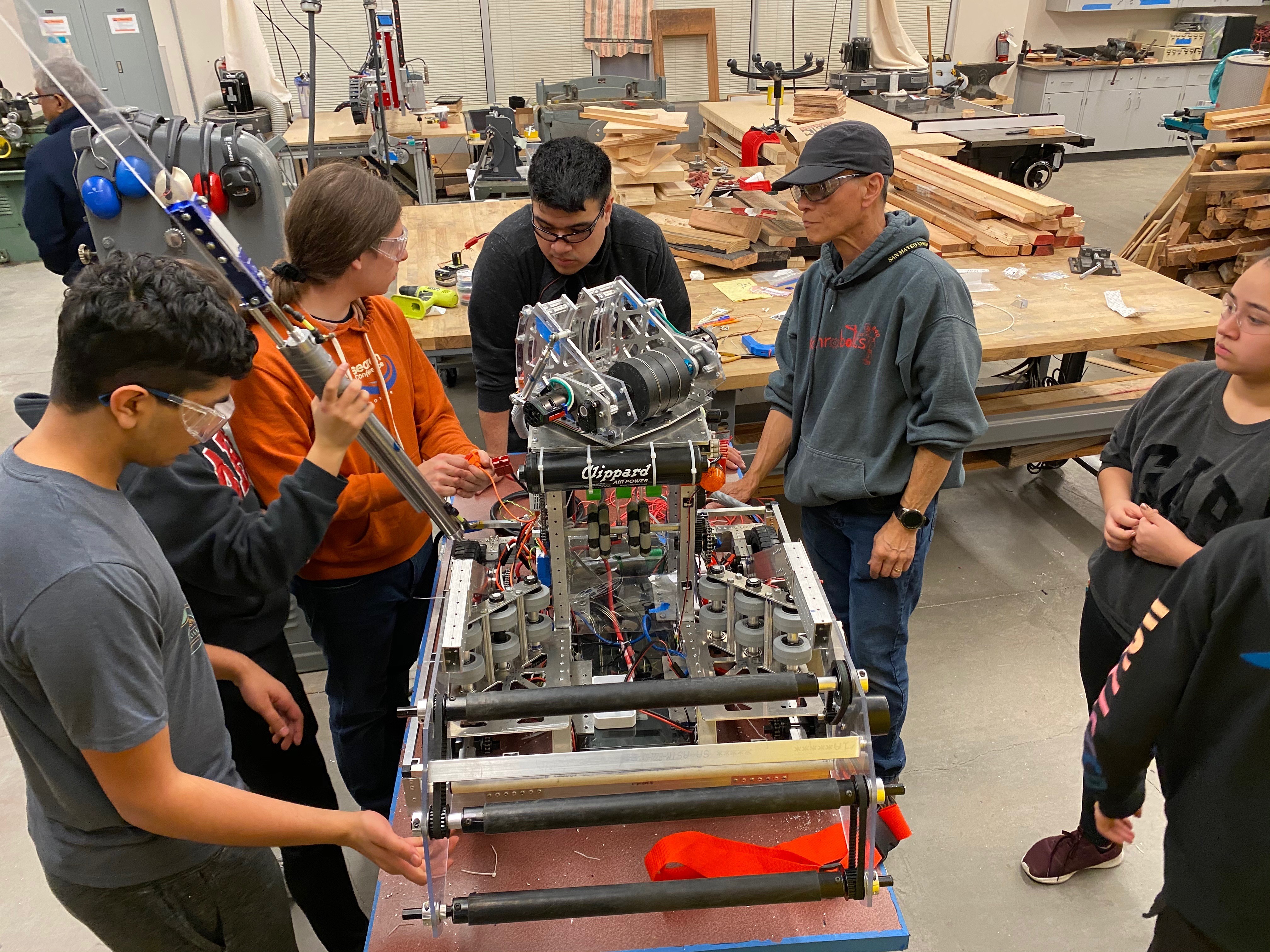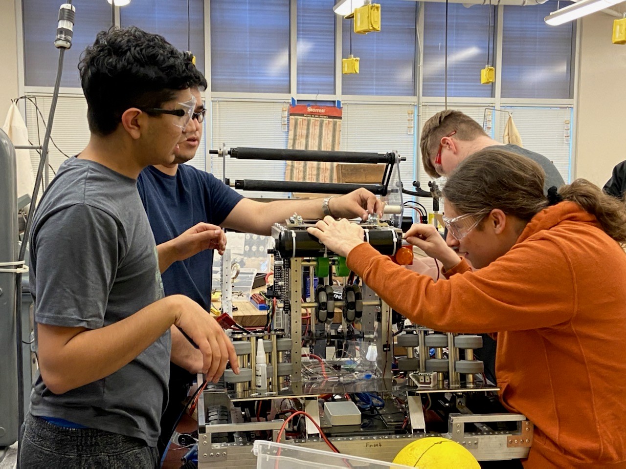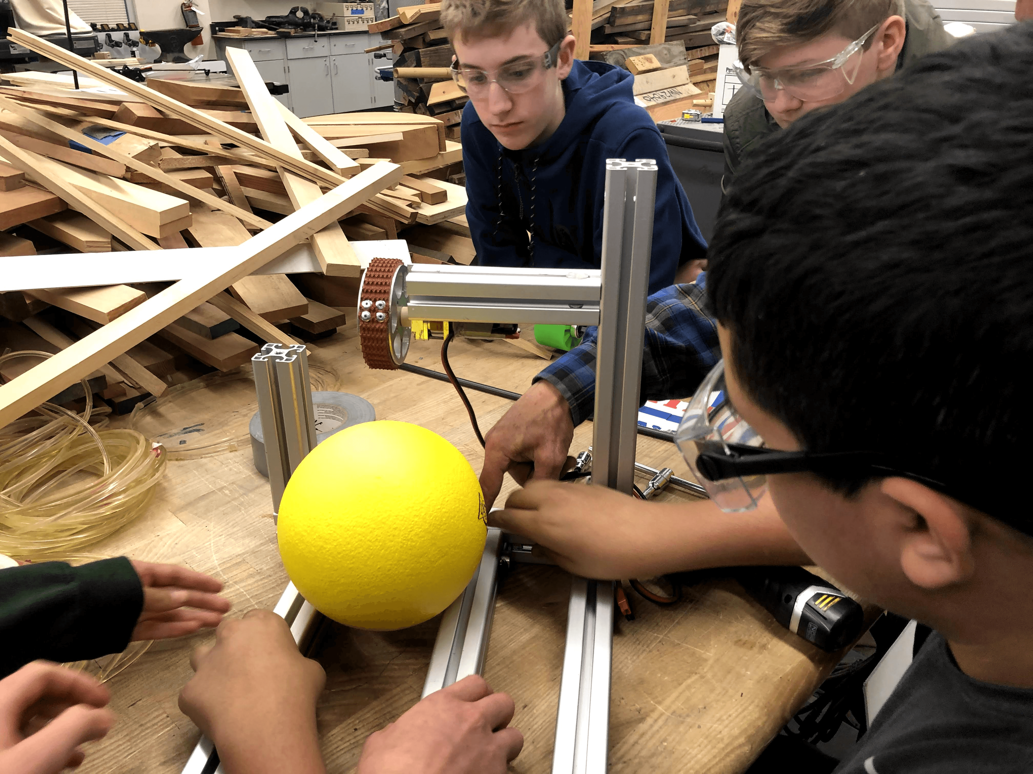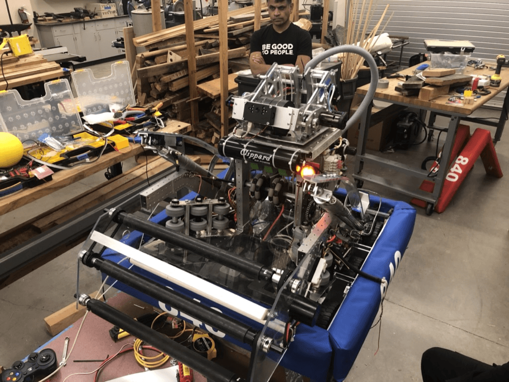 This year’s game centered on shooting yellow 7-inch foam balls (called power cells) into goals positioned at varying heights—the higher the goal, the more points you scored—and then having the robots return to the shield generator to either park or perform a pull-up on a bar for extra points.