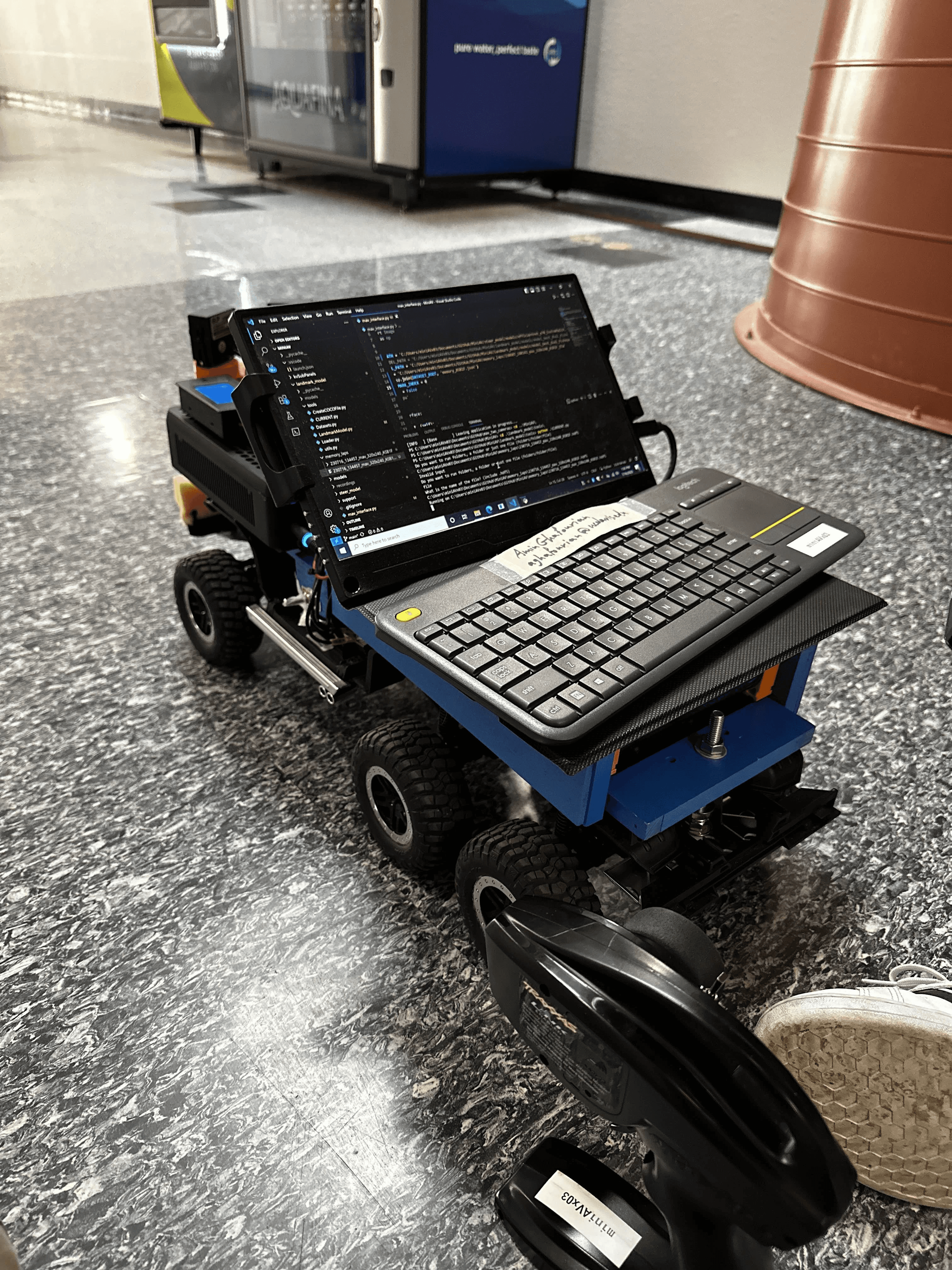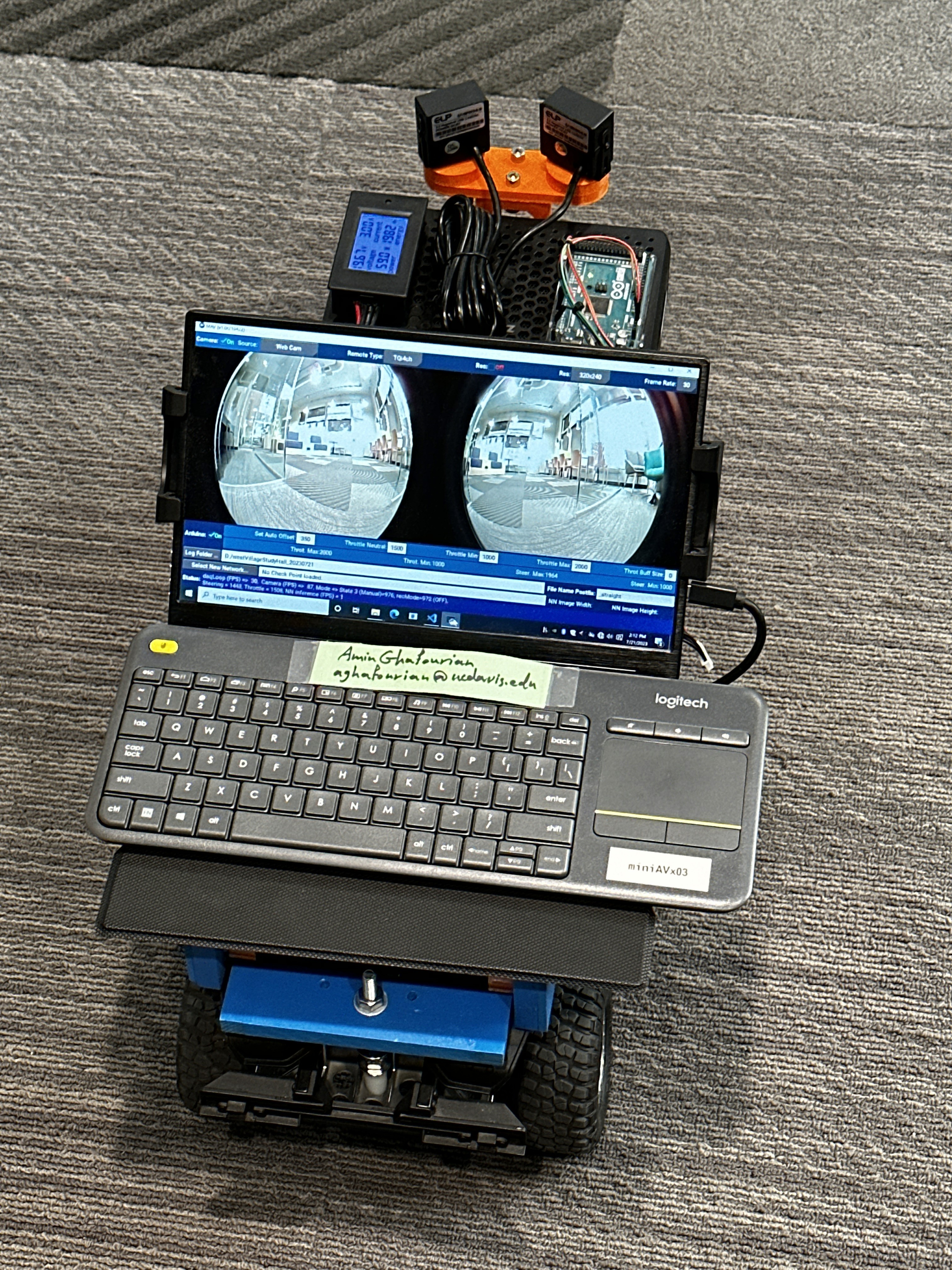 One of my first software projects for the research lab was working on robot navigation using a few images of a landmark and a textual instruction to follow when it reaches it. For this project I worked on a few different things. I was in charge of using OpenCV to calibrate our fisheye cameras. I worked on parts of the steering model and adding certain tools to controller that allowed for easy exports and calibration. I also worked on data collection and cleaning. This involved many weekends of bringing the rover and testing setup to buildings on campus and runningand filming a set of navigation runs throughout the halls of UC Davis.